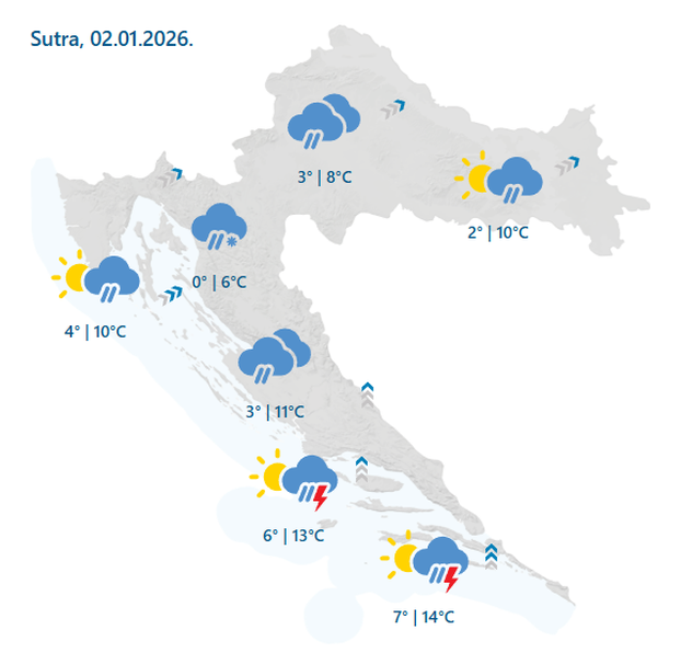 Jutarnja temperatura zraka sutra će se na kopnu kretati od 0 do 4 °C, a na Jadranu između 4 i 8 °C. Najviša dnevna temperatura bit će od 6 do 11 °C, dok će se na moru penjati između 10 i 15 °C.