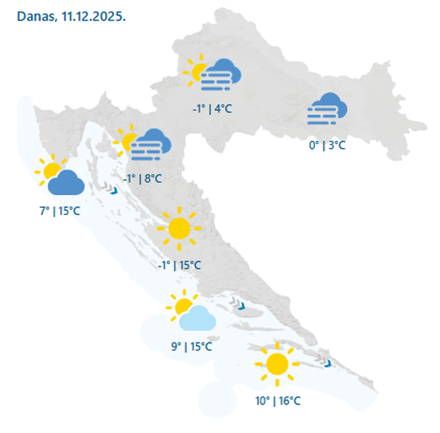 - Na sjevernom Jadranu i u Gorskoj Hrvatskoj djelomice sunčano. Po kotlinama mjestimice magla koje može biti i uz obalu. Vjetar većinom slab sjeverozapadni. Jutarnja temperatura zraka od -3 do 1 °C, uz obalu između 5 i 8 °C. Najviša dnevna od 7 do 9 °C, na moru između 12 i 15 °C - rekao je Dragojlović.