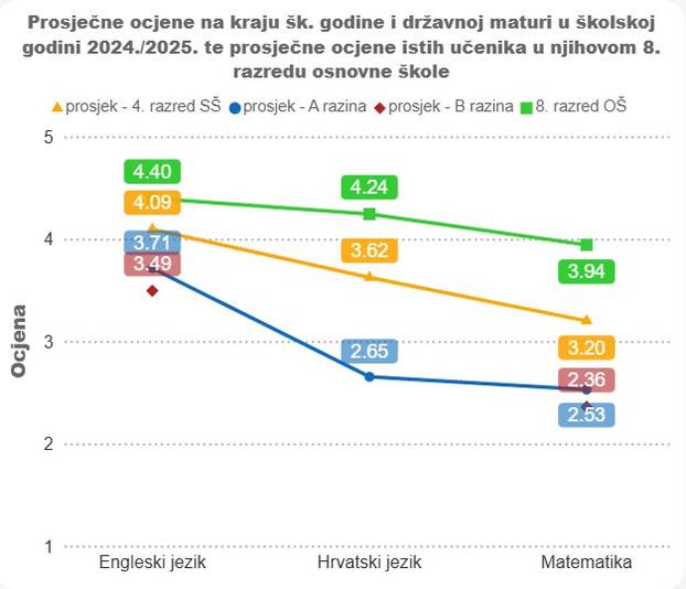 Matematika koja je u prosjeku na kraju 8. razreda 3,94, do državne mature padne na 2,53. Hrvatski jezik s 4,24 pada na 2,65 na maturi, a engleski s 4,49 na 3,49.
