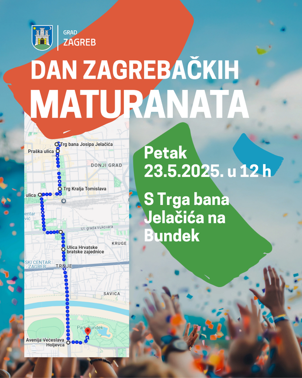 Povorka maturanata koji će se okupiti na Trgu bana Jelačića krenut će prema Bundeku točno u podne. Učenici će kroz grad proći u pratnji nadležnih službi. Program u parku Bundek započinje u 13.00 sati, a završit će u 20.00 sati, uz bogat glazbeni program.