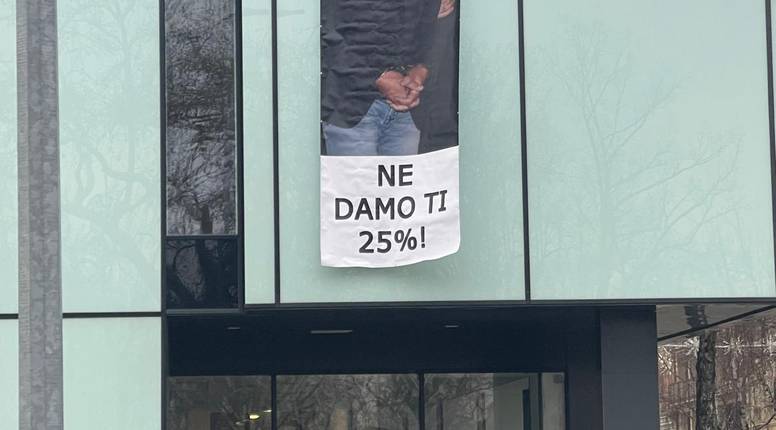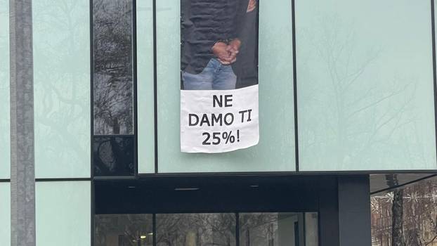 Na njemu je prikaz prvog uhićenja novogradiškog gradonačelnika Vinka Grgića uz poruku: „Ne damo ti 25%!“.