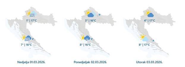 - U unutrašnjosti u nedjelju pretežno sunčano, a ujutro i dio prijepodneva mjestimice i maglovito. U ponedjeljak umjereno do pretežno oblačno, a malo kiše lokalno će pasti u Gorskoj Hrvatskoj gdje će puhati i umjeren jugozapadni vjetar. U utorak barem djelomice sunčano i uglavnom suho. Minimalna temperatura zraka u blagom porastu, a danju i dalje iznadprosječno toplo - pišu iz DHMZ-a.