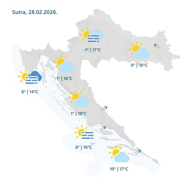 U većini krajeva pretežno sunčano. Na Jadranu ponegdje niski oblaci i magla, uglavnom na sjevernom dijelu, a ujutro će magle mjestimice biti i u unutrašnjosti, stoji u prognozi DHMZ-a za subotu, 28. veljače..