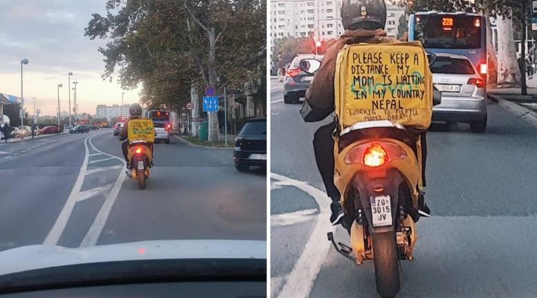 "Molim vas, držite razmak! Mama me čeka u mojoj državi Nepalu. Radim kako bi ostvario mamin san", napisao je jedan dostavljač na svoju torbu za dostavu...
