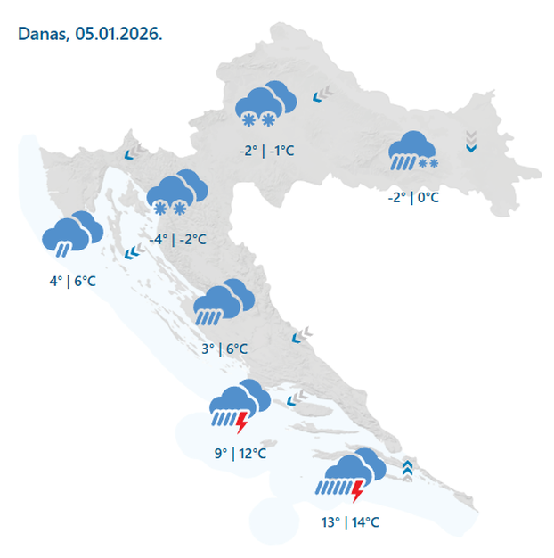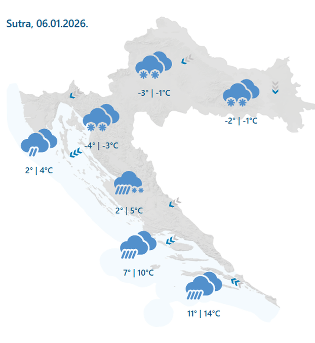 Na sjevernom Jadranu mjestimice je moguć snijeg nošen jakim vjetrom, dok se prema večeri u unutrašnjosti Dalmacije kiša ponegdje može smrzavati na hladnom tlu i predmetima.