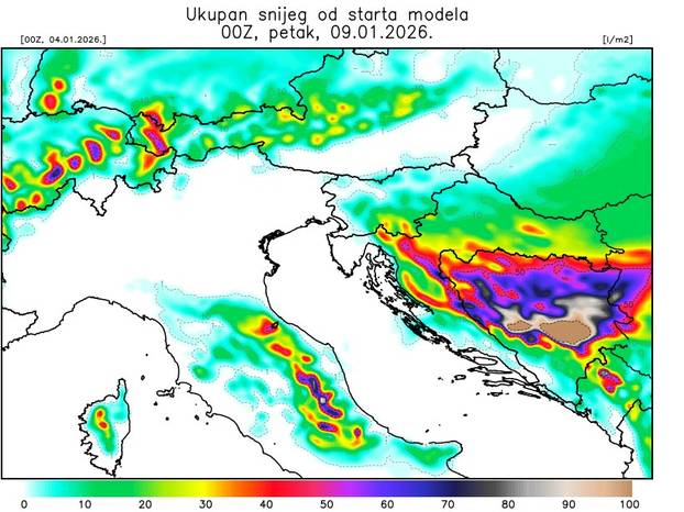 Sljedećih dana čekaju nas iznimno niske temperature ujutro, ali i nastavak snježnih oborina, a WRF model pokazuje da bi najviše akumuliranog snijega moglo biti u BiH i Srbiji te Rumunjskoj. Očekuje se da bi ukupno moglo pasti i metar snijega u danima do kraja tjedna.