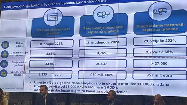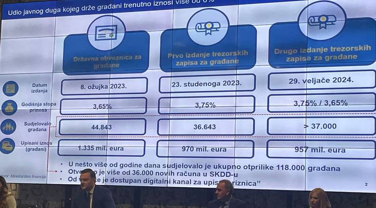 Iz Ministarstva financija su izvijestili da je u dosadašnjim plasmanima državnih vrijednosnica u kojima je omogućeno izravno sudjelovanje građana, realizirano više od 251.000 pojedinačnih ponuda građana u ukupnom iznosu od 7,4 milijardi eura.