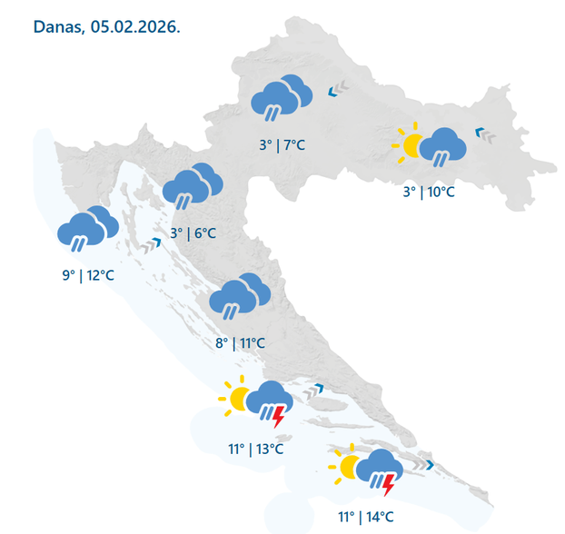 Prema prognozi Državnog hidrometeorološkog zavoda, vrijeme se neće tako brzo smiriti. Za četvrtak je najavljeno promjenjivo do pretežno oblačno vrijeme, povremeno s kišom, a na Jadranu su ponegdje mogući i pljuskovi s grmljavinom. Iako će vjetar slabjeti, na Jadranu će i dalje puhati umjereno do jako jugo i jugozapadnjak.