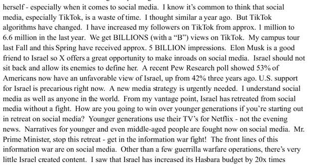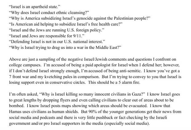 - Moj tim i ja smo mjesecima analizirali te trendove i raspravljali o idejama koje bi vam mogle pomoći da vi i vaša zemlja uzvratite na ove zabrinjavajuće pojave. Antiizraelsko raspoloženje može potkopati američku podršku Izraelu - naveo je u pismu, koje se sada prvi put u cijelosti objavljuje.