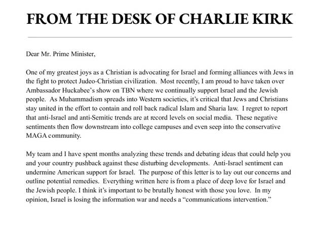 :Ubijeni konzervativni aktivist Charlie Kirk savjetovao je izraelskom premijeru Benjaminu Netanyahuu kako se suprotstaviti „antiizraelskom raspoloženju“ među generacijom Z i kako pobijediti u „informacijskom ratu“ koji se, prema njegovim riječima, vodi protiv židovske države, stoji u pismu do kojeg je došao The New York Post.