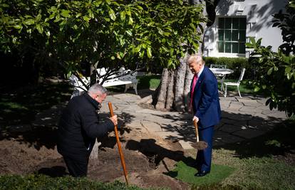 Novinari nisu imali pristup sadnji novog stabla, no Bijela kuća podijelila je fotografije republikanca kako kopa zemlju zlatnom lopatom.