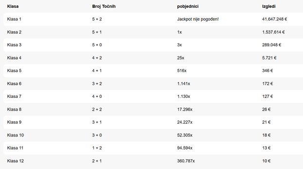 Glavni dobitak (5+2) ovog puta nije osvojen, kao ni dobitak 5+1. Međutim, jedan igrač iz Europe pogodio je kombinaciju 5+1 i osvojio iznos od 1.537.614 eura, dok su dva igrača s dobitkom 5+1 osvojila po 289.047,60 eura. U Hrvatskoj nije bilo dobitnika u ovim najvišim kategorijama.