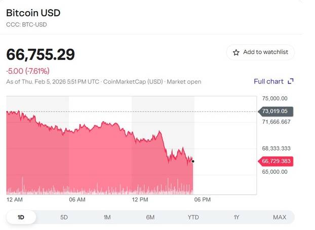 Bitcoin je u četvrtak pao ispod 67.000 dolara, dok je povjerenje ulagača nastavilo slabjeti u imovinu koja je nekoć bila slavljenja kao „digitalno zlato” i jedinstveno sredstvo očuvanja vrijednosti, piše CNBNC.