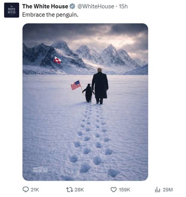 Službeni profil Bijele kuće na društvenoj mreži X objavio je sliku američkog predsjednika Donalda Trumpa kako, držeći pingvina s američkom zastavom, korača snježnim prostranstvima prema planinama na kojima se vijori zastava Grenlanda. "Prigrlite pingvina", stajalo je u opisu.