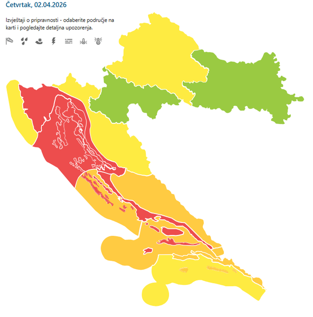 A što nas čeka sutra? Sudeći prema prognozi DHMZ-a, u četvrtak neće biti ništa 'lakše'. Istra i Kvarner uz područje Velebita su u 'crvenom', a ostatak Jadrana je u 'narančastom'.