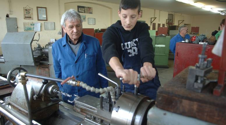 U školskoj radionici s učenicima su cijelo vrijeme četiri majstora. Jedan radi na tehničkoj pripremi, dvojica sa strojobravarima i jedan s tokarima.