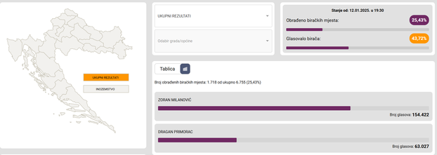 Prema podacima od 19.40 sati, Milanović je na 72,55 posto, a Primorac na 27,45 posto.