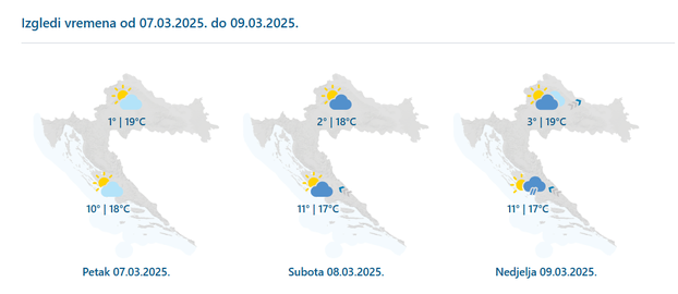 U unutrašnjosti u petak i subotu pretežno sunčano, a jutra u nizinama ponegdje s kratkotrajnom maglom. Više će oblaka biti u nedjelju kada se u Gorskome kotaru i Lici te unutrašnjosti Dalmacije očekuje i malo kiše.