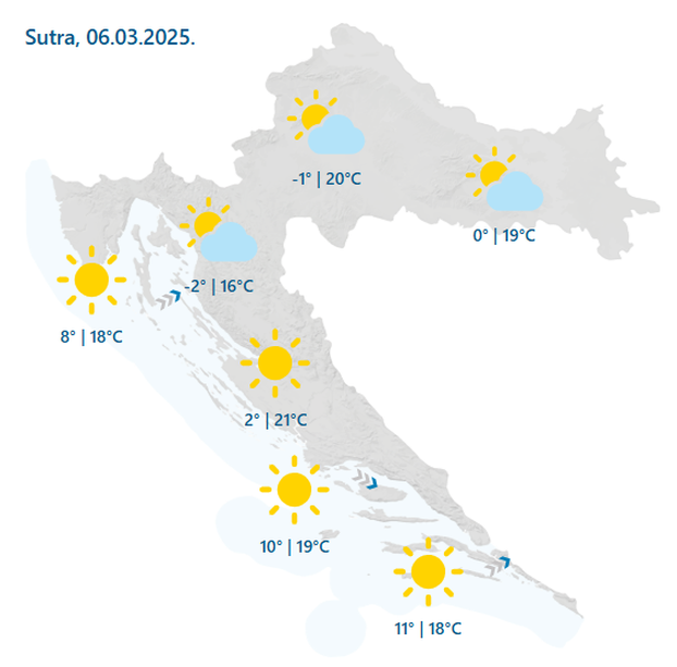 Najniža temperatura bit će od -2 do 2, na Jadranu od 7 do 12 °C, dok će najviša biti uglavnom između 16 i 21 °C.