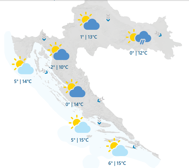 Jutro hladno na kopnu od -2 do 2 °C, uz obalu malo blaže, od 3 do 8 °C. Danju ugodnije, temperature se penju do 17 °C.