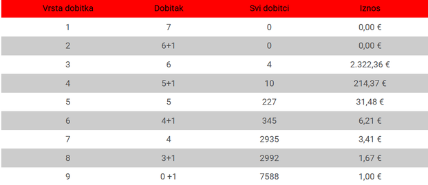 Nažalost, ni u ovom kolu nije bilo dobitnika sedmice (7 pogodaka), kao ni dobitnika s pogođenih 6+1 brojeva. Najveći iznos osvojen je za šest pogodaka, gdje su četiri dobitnika osvojila po 2.322,36 eura.