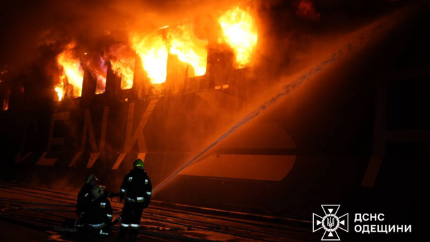 Ukrajinski predsjednik Volodimir Zelenski objavio je fotografije koje prikazuju veliki požar na brodu u luci Čornomorsk u Odeskoj regiji, dok vatrogasci gase požar.