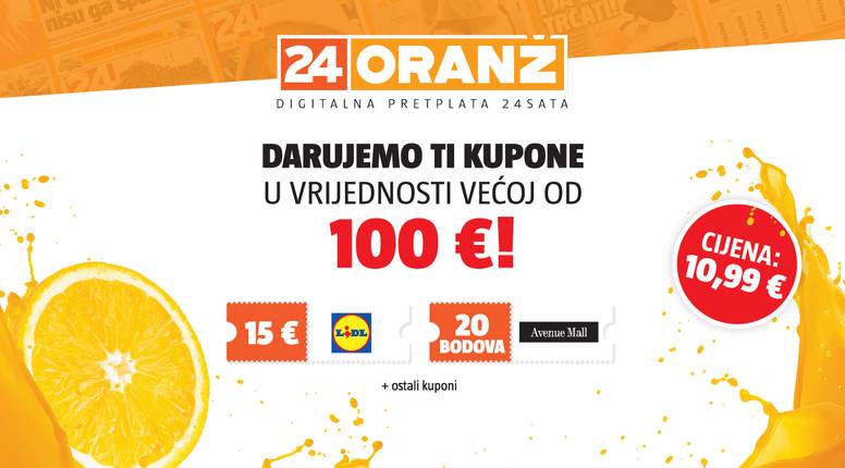 Ove godine slavimo prvih 20 godina postojanja i tim povodom smo cijenu Oranž pretplate snizili više od 50 %. Za samo 10,99 € dajemo ti mogućnost da se pretplatiš na digitalnu pretplatu 24 Oranž, uživaš u neograničenom pristupu cijelom sadržaju portala 24sata.hr, vrijednim kuponima te popustima. Među benefitima su 20 bodova na VIP Loyalty kartici za Avenue Mall (ekvivalentno 20 €), kupon od 15 € za Lidl, te više od 100 € dodatnih kupona za razne proizvode i usluge.
