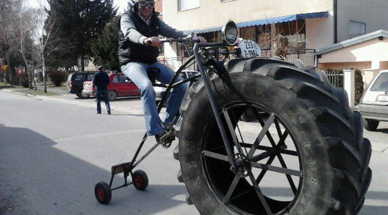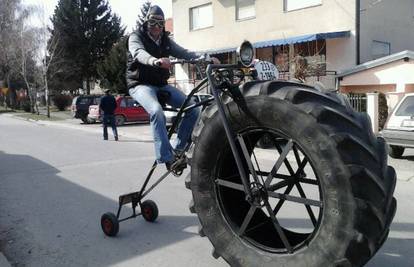 Slagali smo ga tri tjedna. Konstrukciju smo napravili od željeznih cijevi, a prednji kotač od metar i pol uzeli smo s kombajna, rekao nam je Franjo Razum, izumitelj iz Samobora.