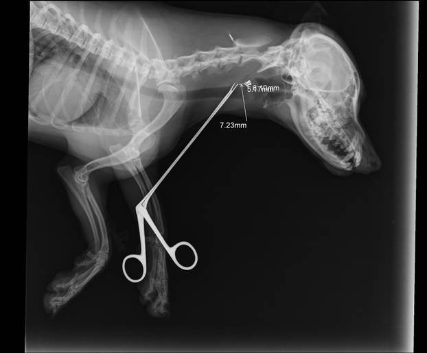 - Sinoć tijekom šetnje pas se trznuo, a kada su došli kući vidjeli su krv iz vrata. Bili su u stanici Pakrac i tamo su obradili ranu. Metak je veličine dijabole 6,10 - 5,16 mm. Metak je visoko gore i duboko kod kralješka. Zbog izazivanja većih lezija odustalo se od vađenja metka - stoji u nalazu kujice Lene.