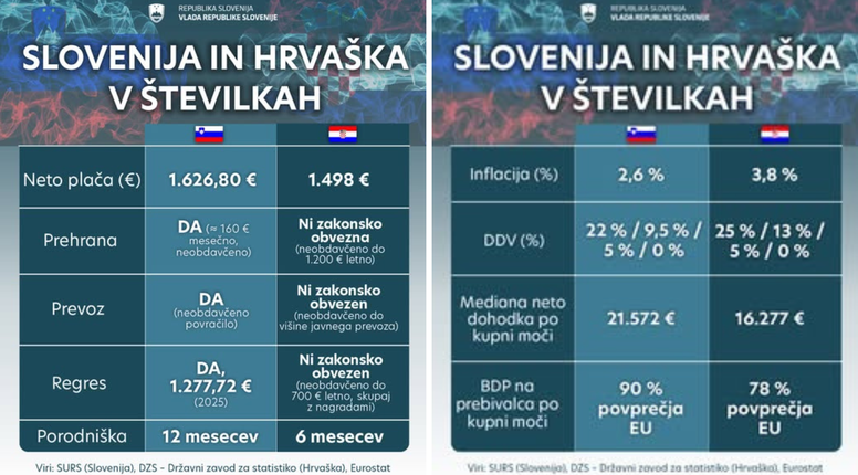 Tako su objavili da je prosječna neto plaća u Sloveniji 1626.80 eura, dok je u Hrvatskoj 1498 eura. Uz to, slovenski radnici mjesečno primaju i neoporezivu naknadu za prehranu od 160 eura
