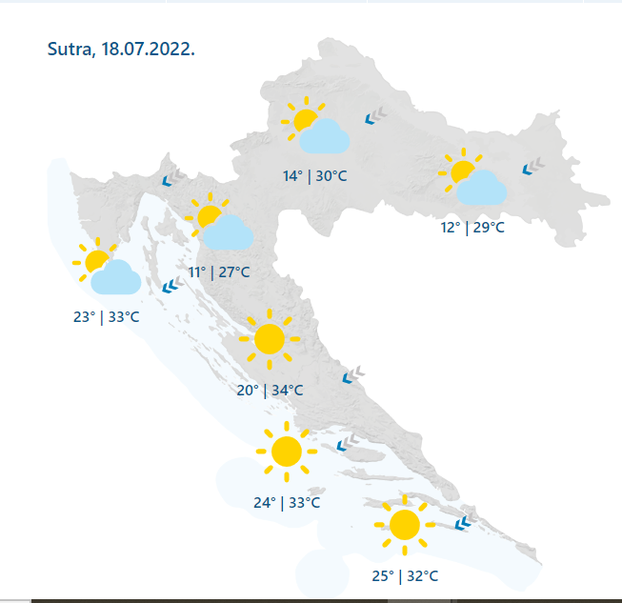 DHMZ najavljuje sunčano vrijeme, ponegdje s malom do umjerenom naoblakom. Vjetar na kopnu slab, popodne do umjeren sjeveroistočni. Na Jadranu umjerena bura, uglavnom podno Velebita te na jugu ponegdje i jaka, poslijepodne će većinom okrenuti na zapadnjak i sjeverozapadnjak. Najniža jutarnja temperatura uglavnom od 11 do 16, ponegdje i viša, a na moru od 21 do 26 °C. Najviša dnevna temperatura većinom od 29 do 34 °C, u gorju malo niža.