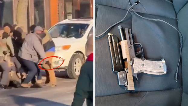 Tada se događa ključni trenutak koji demantira službenu verziju. Dok se agenti bore da svladaju Prettija na tlu, prilazi im još jedan kolega, odjeven u sivi kaput. Na snimci se jasno vidi kako prilazi praznih ruku. Sagiba se prema hrpi tijela, poseže prema Prettijevom struku i uspravlja se držeći pištolj u desnoj ruci. Oružje izgledom odgovara onome sa slike koju je objavila Bijela kuća. U tom trenutku, netko viče: "Gun!" (Pištolj!).