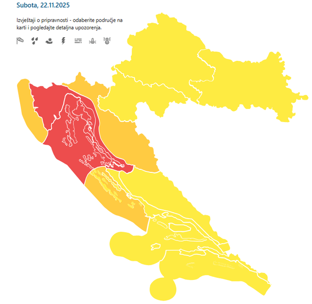 Ostatak Hrvatske pod žutim je meteoalarmom. Za sjeverni dio Hrvatske i Slavonija na snazi je zbog snijega i poledice, dok je Dalmacija i jug zemlje pod meteoalarmom zbog olujnog vjetra.