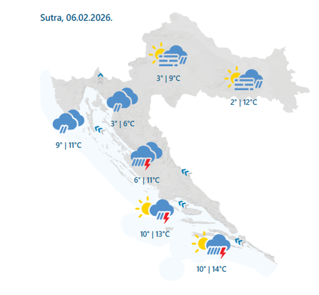 Na zapadu zemlje bit će pretežno oblačno s kišom, lokalno i obilnijom. U najvišim dijelovima gorja moguća je susnježica, dok će se po kotlinama zadržavati magla. Na moru će biti razmjerno vjetrovito, jak vjetar mijenjat će smjer s juga na zapadni i sjeverozapadni. Najviša temperatura u Gorskoj Hrvatskoj oko 6 °C, a na sjevernom Jadranu oko 11 °C.