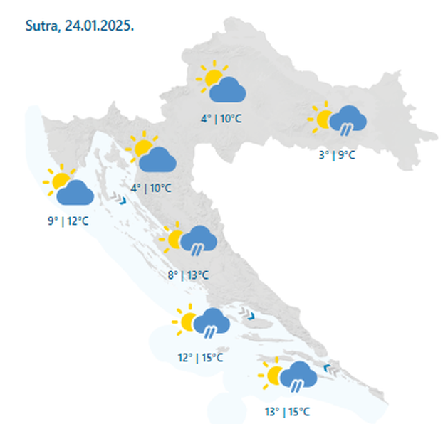 - Ujutro oblačno ponegdje još s kišom, osobito na istoku i jugu. Već prijepodne sa zapada razvedravanje, navečer mjestimice magla. Vjetar većinom slab, na dijelu Jadrana do umjeren sjeverozapadnjak, na jugu umjereno jugo - navode iz DHMZ-a.