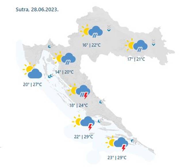 U većini krajeva tijekom prijepodneva postupan porast naoblake. Kiša i grmljavina ponegdje već sredinom dana, a osobito kasno poslijepodne i navečer. Mjestimice može biti izraženijih pljuskova. U Dalmaciji pretežno sunčano. Zapuhat će slab do umjeren sjeverac i sjeveroistočnjak, ponegdje moguće s jakim udarima. Na Jadranu slab do umjeren jugozapadnjak i zapadnjak, a na sjevernom dijelu navečer će okrenuti na buru i jačati. Najviša dnevna temperatura zraka uglavnom od 25 do 29, a na Jadranu i do 33 °C, piše DHMZ.
