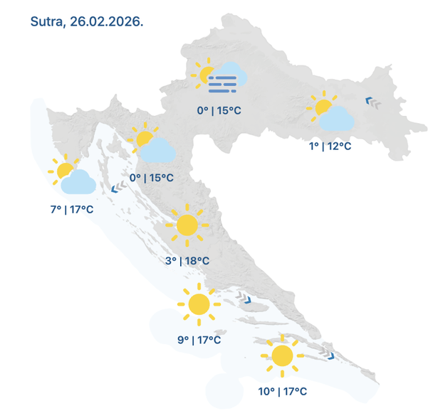 U unutrašnjosti će jutro mjestimice započeti uz maglu, osobito u Posavini i kotlinama, dok je kratkotrajna magla moguća i na sjevernom Jadranu te uz zapadnu obalu Istre. Tijekom dana prevladavat će sunčano vrijeme, iako u središnjim krajevima povremeno može biti prolazne umjerene naoblake.