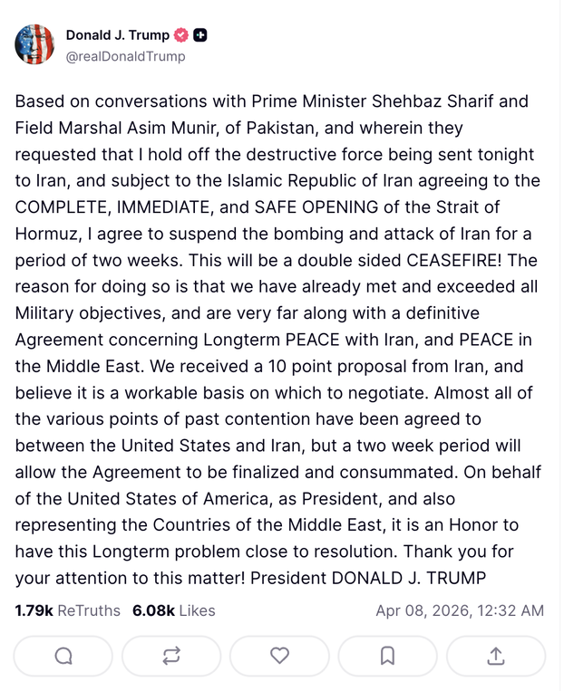 Sjedinjene Američke Države i Iran postigli su u posljednjem trenutku dvotjedni prekid vatre, čime je zaustavljena neposredna opasnost od daljnje eskalacije rata samo oko sat i pol prije isteka ultimatuma koji je američki predsjednik Donald Trump postavio Teheranu. Prema Trumpovoj objavi, obustava američkih napada vezana je uz "potpuno, trenutačno i sigurno ponovno otvaranje Hormuškog tjesnaca", a dogovor je postignut nakon posredovanja Pakistana. Trump je pritom naveo da je riječ o "obostranom prekidu vatre" i da je Washington od Irana primio deseterotočkani prijedlog koji smatra "provedivom osnovom za pregovore".