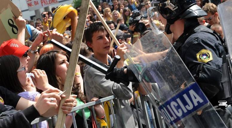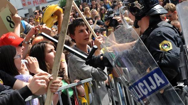Tisuće studenata su u srijedu prosvjedovali u Ljubljani. Neki od njih su zgradu parlamenta gađali jajima, kamenjem, bocama, granitnim kockama i molotovljevim koktelima. Ošteteili su prozore i zapalili grmlje oko parlamaneta. Vatru su ubrzo ugasili vatrogasci. Prosvjednici su u jednom trenutku probili i zaštitnu ogradu koju je postavila policija, ali su ih policajci ubrzo svladali. Uhitili su 30 prosvjednika. Najmanje devet policajaca je ozlijeđeno. Morala je interevenirati i hitna pomoć koja je odvezla jednog demostranta. Prosvjednici se bune protiv toga da im se ukine subvencioniranje prehrane kao i protiv promjena Zakona o povremenom radu te novog načina stipendiranja. Studenti se kako kažu, bore i za prava svojih roditelje te se bune protiv mirovinske reforme. Upozoravaju i da je trenutno u Sloveniji 100.000 ljudi bez posla. Prosvjednici su nosili transparente na kojima je između ostalog pisalo "Vlada, j... si mater!" i "Hoćemo bonove za pivo".