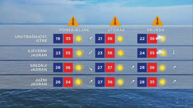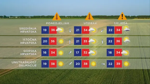 Sunčano i vrlo vruće bit će i početkom tjedna. Prolazno više oblaka u ponedjeljak i utorak u popodnevnim satima, posebice na sjeverozapadu i sjeveru zemlje uz povećanu vjerojatnost i za poneki pljusak, moguće i izraženiji. Mjestimične će kiše te lokalnih pljuskova s grmljavinom, moguće i nevremena, najvjerojatnije biti u srijedu.