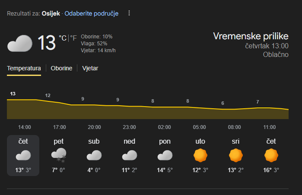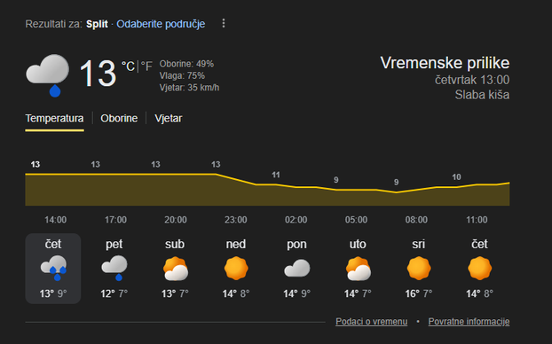 U unutrašnjosti će temperatura većinom biti između 1 i 6 °C, a navečer će dodatno pasti. Na Jadranu će se temperature kretati od 10 do 13 °C.