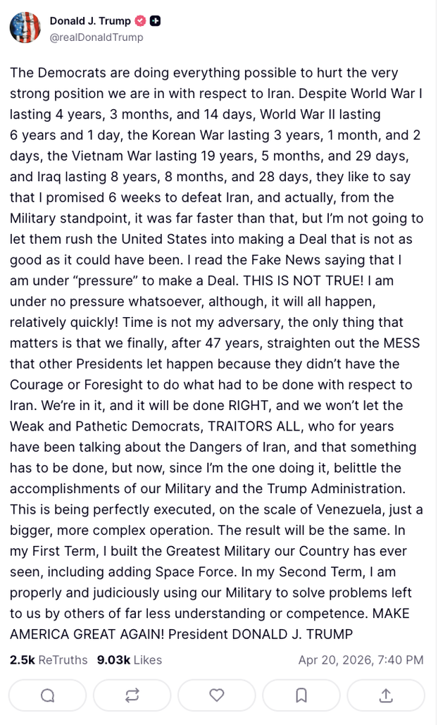 - Demokrati čine sve što mogu kako bi naštetili vrlo snažnoj poziciji u kojoj se nalazimo u odnosu na Iran. Iako je Prvi svjetski rat trajao 4 godine, 3 mjeseca i 14 dana, Drugi svjetski rat 6 godina i 1 dan, Korejski rat 3 godine, 1 mjesec i 2 dana, Vijetnamski rat 19 godina, 5 mjeseci i 29 dana, a Irak 8 godina, 8 mjeseci i 28 dana, oni vole govoriti da sam obećao poraziti Iran za 6 tjedana, a zapravo je, s vojnog stajališta, to bilo puno brže od toga, ali neću dopustiti da požuruju Sjedinjene Države u sklapanju sporazuma koji nije onoliko dobar koliko bi mogao biti.