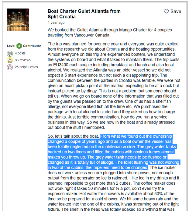 Putnici su napisali kako su iskusni moreplovci i znali su da sa starijim brodom ne mogu očekivati luksuz od 5 zvjezdica, ali ne i takvo razočaranje. Navode da je brod bio potpuno zanemaren i da su se spremnici za otpadne vode dva puta začepili te ispunili kabine odvratnim smradom, a dodali su i da zahodi u dvije kabine nisu radili. Isto tako i agregat na brodu je bio preslab za ledomat koji je radio samo kad su bili priključeni na struju na vezu.