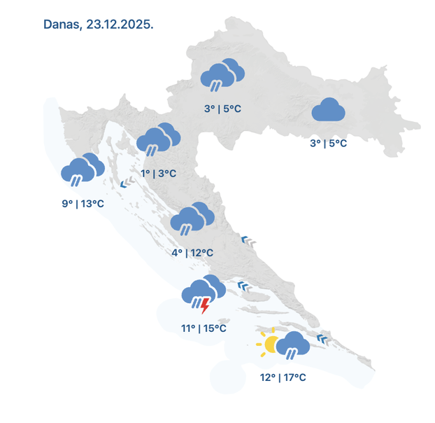 Na Badnjak će vrijeme biti promjenljivo, u unutrašnjosti pretežno oblačno. Mjestimice će padati kiša, dok se u Dalmaciji očekuju izraženiji pljuskovi s grmljavinom...