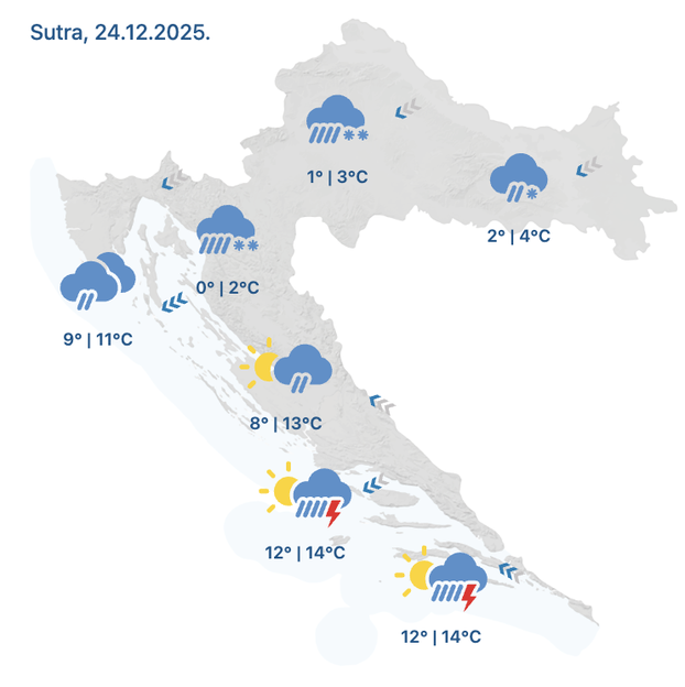 Na Badnjak će vrijeme biti promjenljivo, u unutrašnjosti pretežno oblačno. Mjestimice će padati kiša, dok se u Dalmaciji očekuju izraženiji pljuskovi s grmljavinom. Zbog pada temperature, u unutrašnjosti će kiša prelaziti u susnježicu i snijeg, a u gorskim krajevima očekuje se stvaranje snježnog pokrivača.