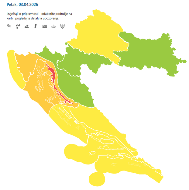Za petak izdano je crveno upozorenje za Velebitski kanal, a narančasto za Riječku regiju te za Kvarner i Kvarnerić. Kako prognoziraju, u prvom dijelu dana očekuje se promjenljivo vrijeme, a u unutrašnjosti će biti pretežno oblačno, ponegdje uz malo kiše. U središnjim i istočnim predjelima moguć je i poneki pljusak. Slijedi potom postupno razvedravanje sa zapada.