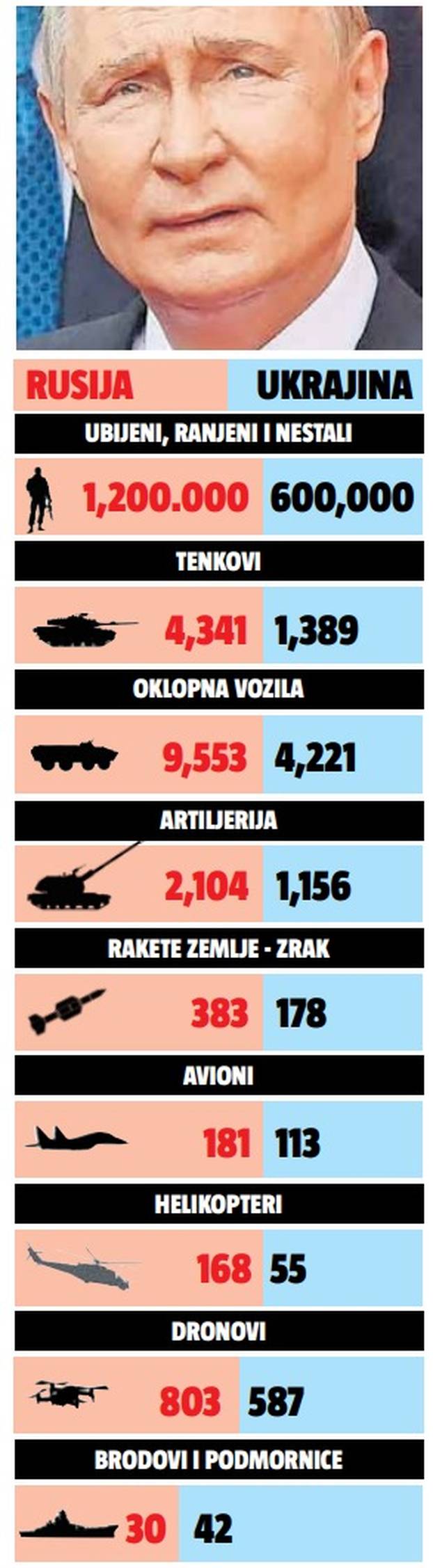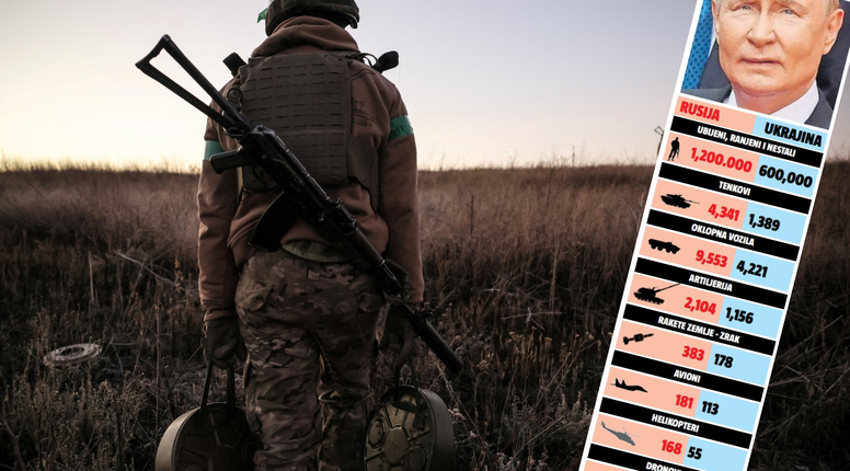 Prema dostupnim podacima, barem onim okvirnim, Rusija se ne može pohvaliti da joj je rat donio toliko toga dobroga. Naime, u ratu su ostali bez gotovo 1,2 milijuna ljudi, čak duplo više od Ukrajine. Izgubili su 4341 tenkova spram ukrajinskih 1398.