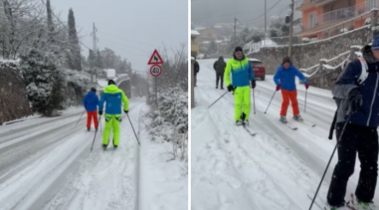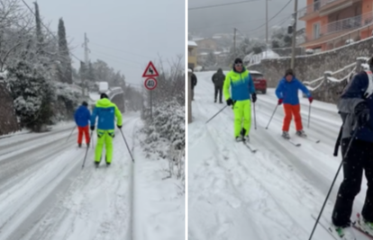 Ekipa veselih skijaša iz mjesta Bregi u blizini Opatije snježni kaos pretvorila je u zabavu, a neočišćene ceste u improviziranu skijašku stazu, prenosi Poduckun.net.