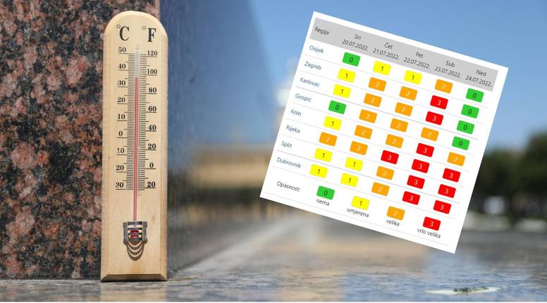 U subotu gotovo cijelu Hrvatsku očekuje toplinski val - Državni hidrometeorološki zavod izdao je upozorenje za Zagreb, Karlovac, Knin, Rijeku, Split i Dubrovnik, gdje je mogućnost toplinskog vala vrlo velika, temperature će negdje prelaziti i 40 stupnjeva. Za Osijek i Gospić, u subotu, mogućnost toplinskog vala je po ljestvici DHMZ-a "samo" velika, što je stupanj manja opasnost nego drugdje, no svuda će biti jako toplo.