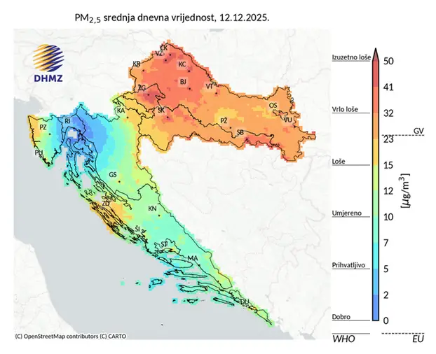 DHMZ je zbog guste magle izdao žuto upozorenje za zagrebačko područje, a prognoze za sljedeća tri dana najavljuju lošu do vrlo lošu kvalitetu zraka. Karte srednjih dnevnih vrijednosti PM2.5 pokazuju da se povišene koncentracije čestica ne javljaju samo povremeno, već se zadržavaju tijekom cijelog dana, što upućuje na trajno pogoršane uvjete.